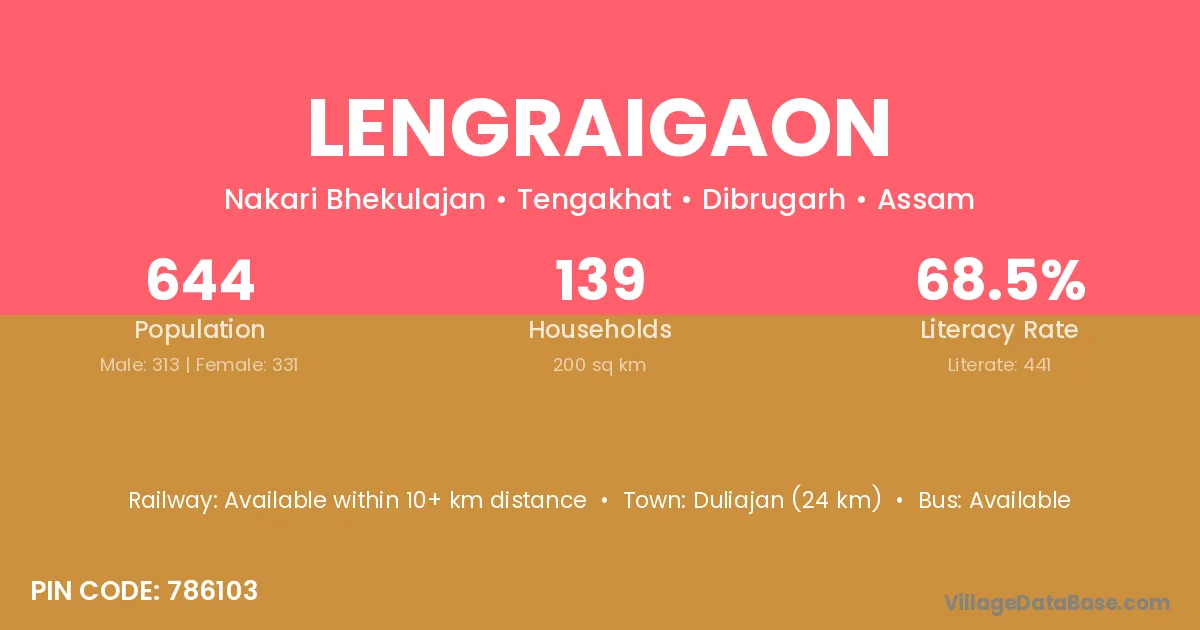 Duliajan (24 km) is the nearest town to Lengraigaon village for major economic activities and is located approximately 24 km away.