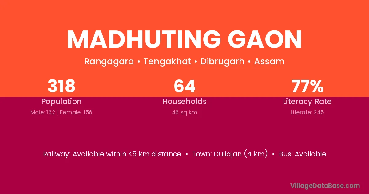 Duliajan (4 km) is the nearest town to Madhuting Gaon village for major economic activities and is located approximately 4 km away.