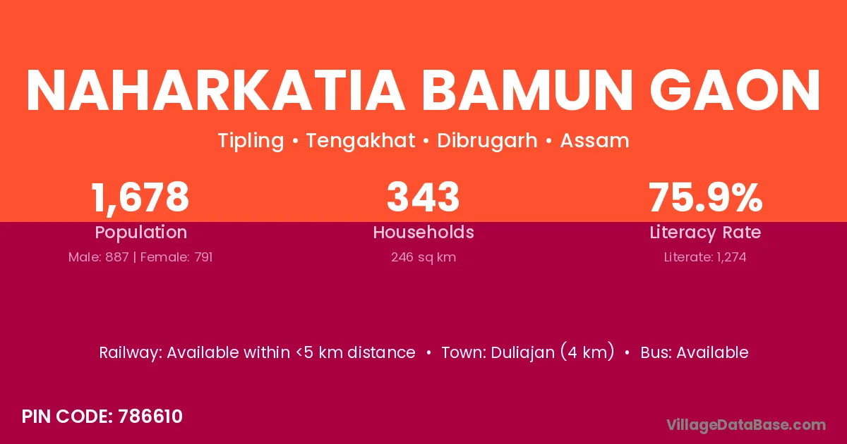 Naharkatia Bamun Gaon village has a total population of 1,678 people, of which 887 are males and 791 are females.