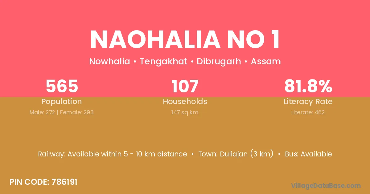 Duliajan (3 km) is the nearest town to Naohalia No 1 village for major economic activities and is located approximately 3 km away.