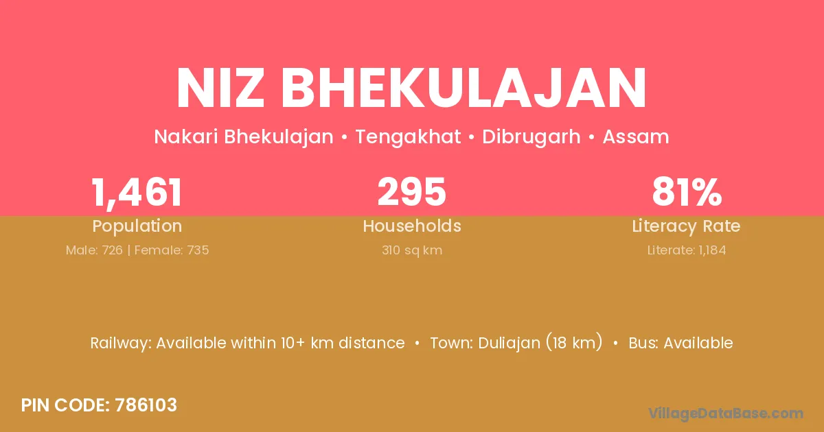 Duliajan (18 km) is the nearest town to Niz Bhekulajan village for major economic activities and is located approximately 18 km away.