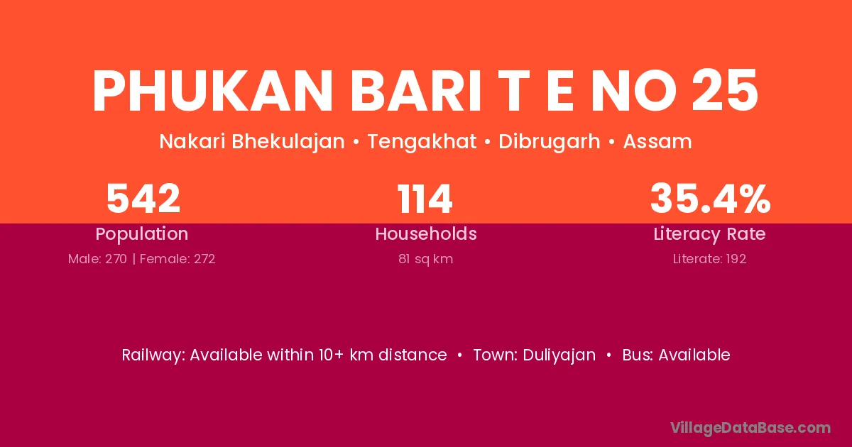 Phukan Bari T E No 25 village has a total population of 542 people, of which 270 are males and 272 are females.