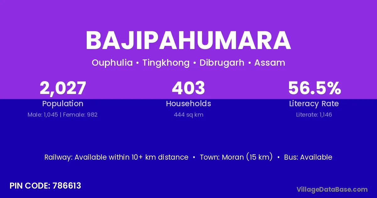 Moran (15 km) is the nearest town to Bajipahumara village for major economic activities and is located approximately 15 km away.