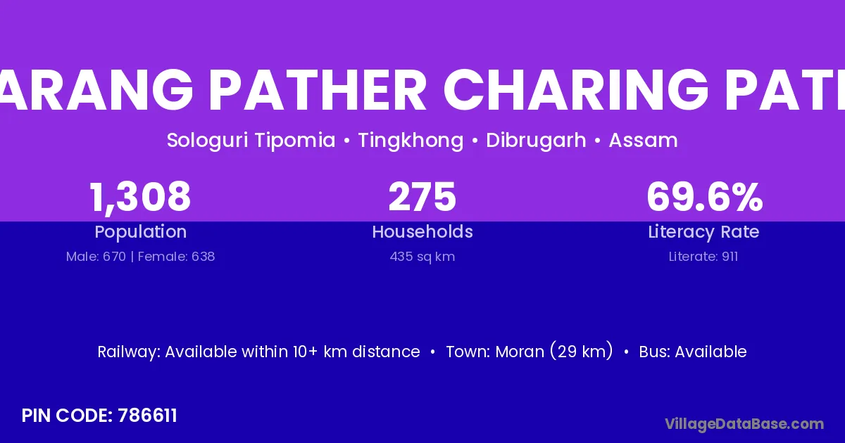 Moran (29 km) is the nearest town to Charang Pather Charing Pather village for major economic activities and is located approximately 29 km away.