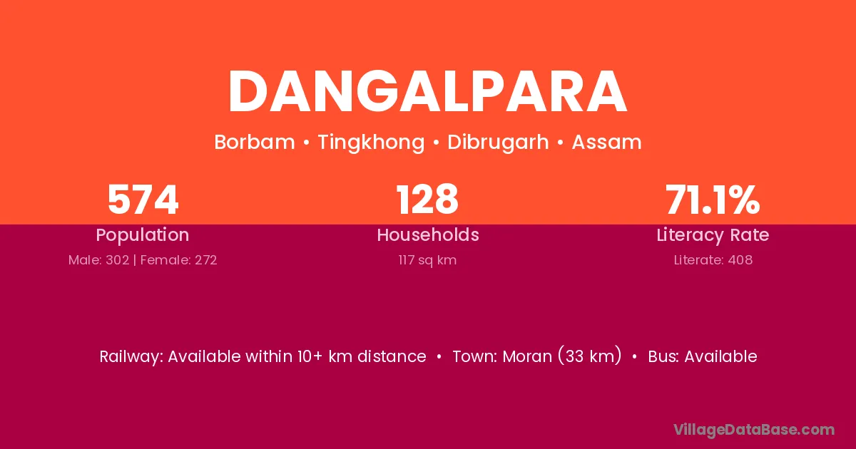 Moran (33 km) is the nearest town to Dangalpara village for major economic activities and is located approximately 33 km away.