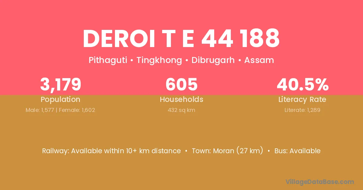 Deroi T E 44 188 village has a total population of 3,179 people, of which 1,577 are males and 1,602 are females.