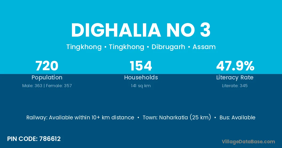 Naharkatia (25 km) is the nearest town to Dighalia No 3 village for major economic activities and is located approximately 25 km away.