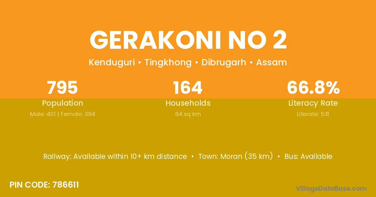 Moran (35 km) is the nearest town to Gerakoni No 2 village for major economic activities and is located approximately 35 km away.