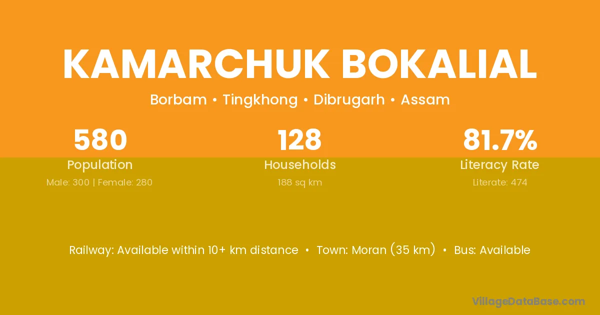 Moran (35 km) is the nearest town to Kamarchuk Bokalial village for major economic activities and is located approximately 35 km away.