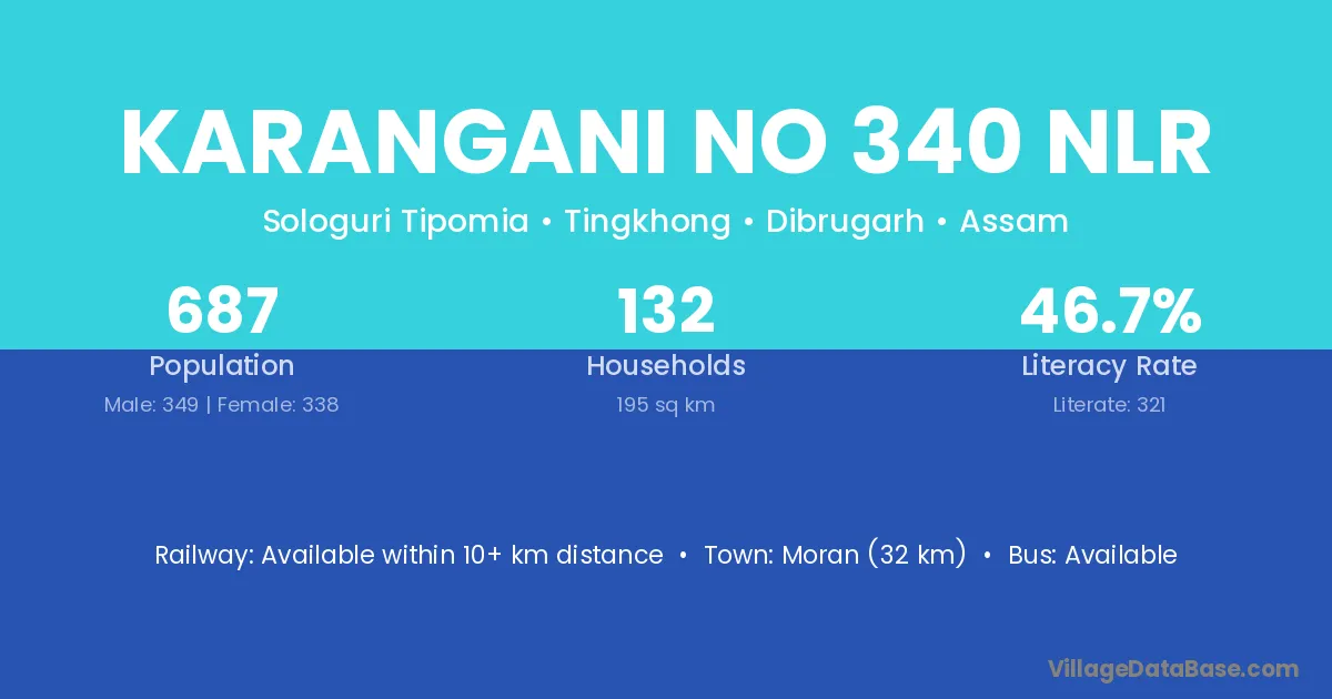 Moran (32 km) is the nearest town to Karangani No 340 Nlr village for major economic activities and is located approximately 32 km away.