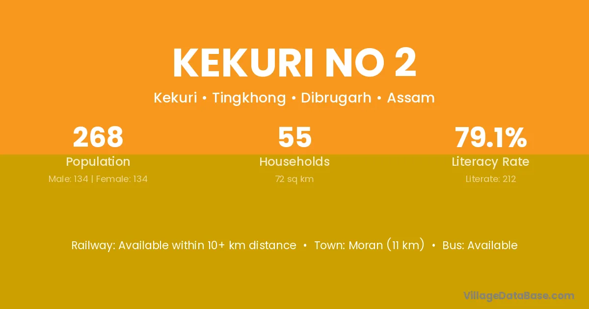 Moran (11 km) is the nearest town to Kekuri No 2 village for major economic activities and is located approximately 11 km away.