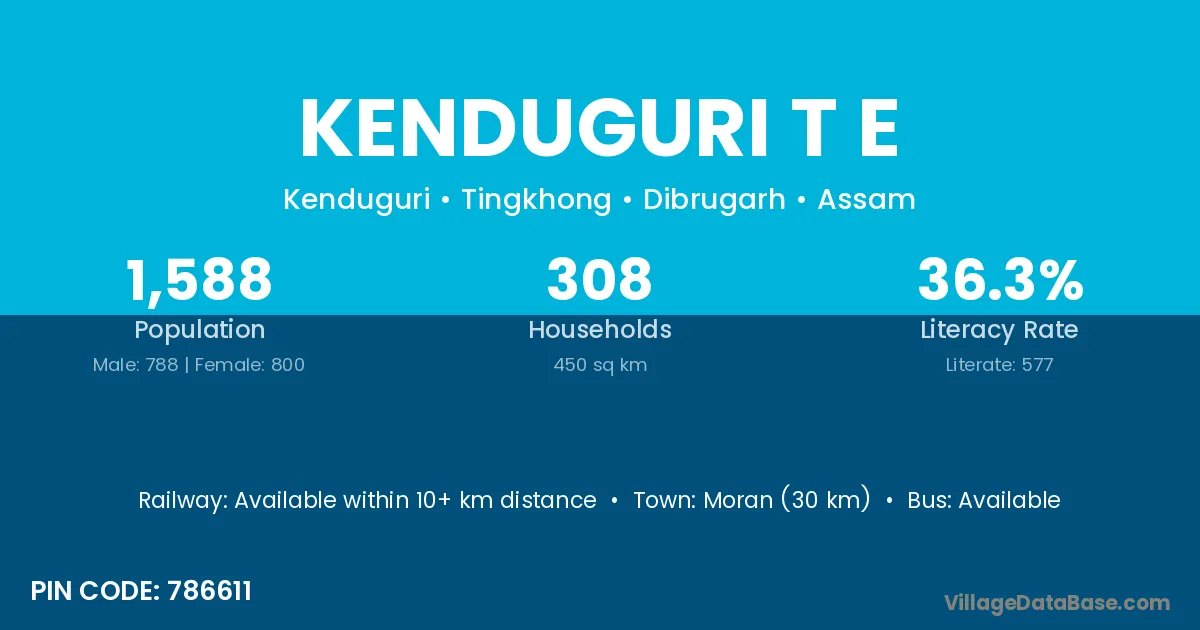 Moran (30 km) is the nearest town to Kenduguri T E village for major economic activities and is located approximately 30 km away.