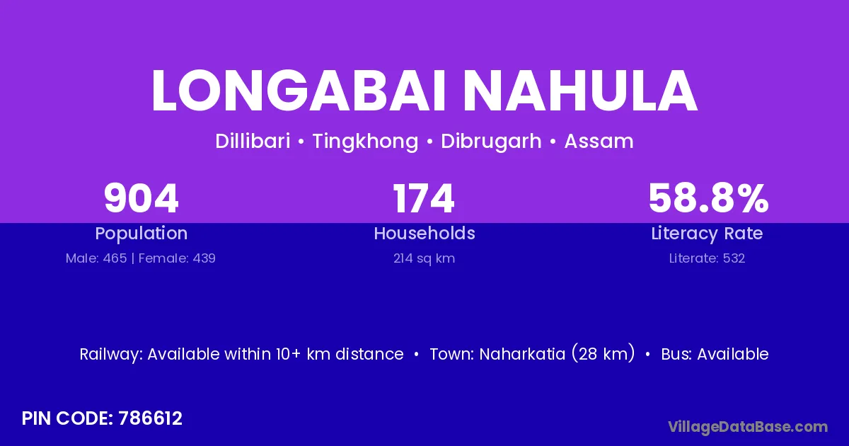 Naharkatia (28 km) is the nearest town to Longabai Nahula village for major economic activities and is located approximately 28 km away.