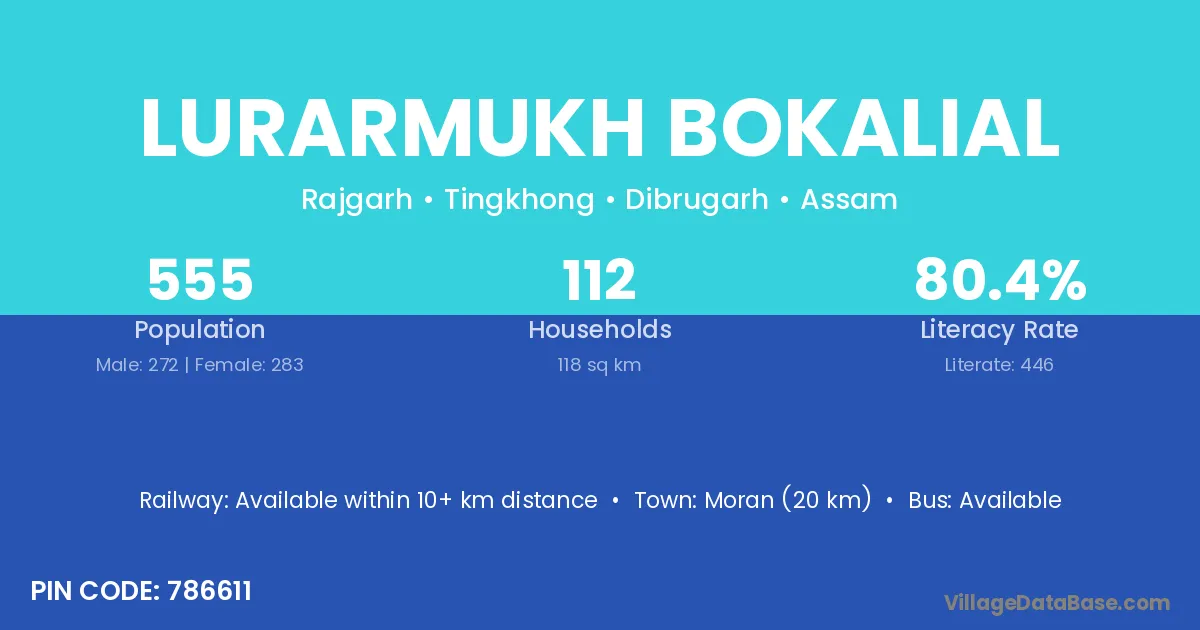 Moran (20 km) is the nearest town to Lurarmukh Bokalial village for major economic activities and is located approximately 20 km away.