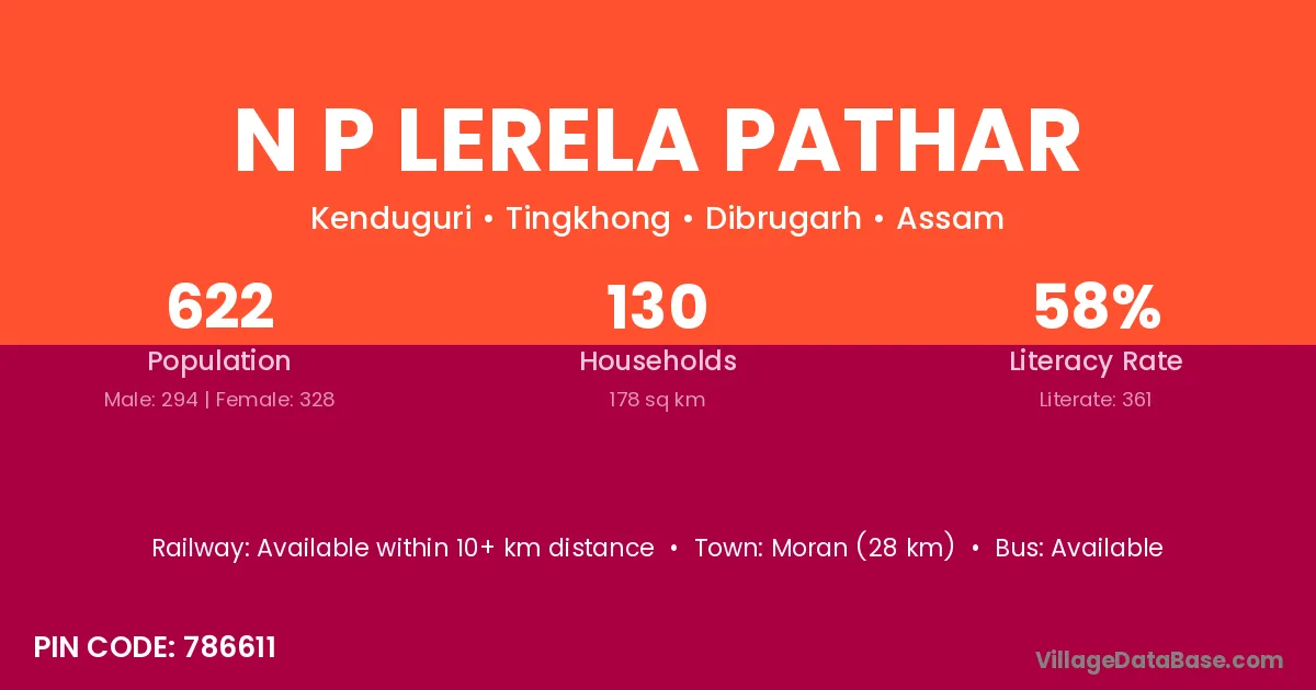 Moran (28 km) is the nearest town to N P Lerela Pathar village for major economic activities and is located approximately 28 km away.