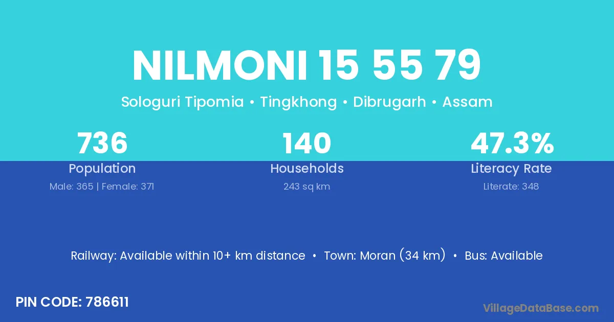 Moran (34 km) is the nearest town to Nilmoni 15 55 79 village for major economic activities and is located approximately 34 km away.