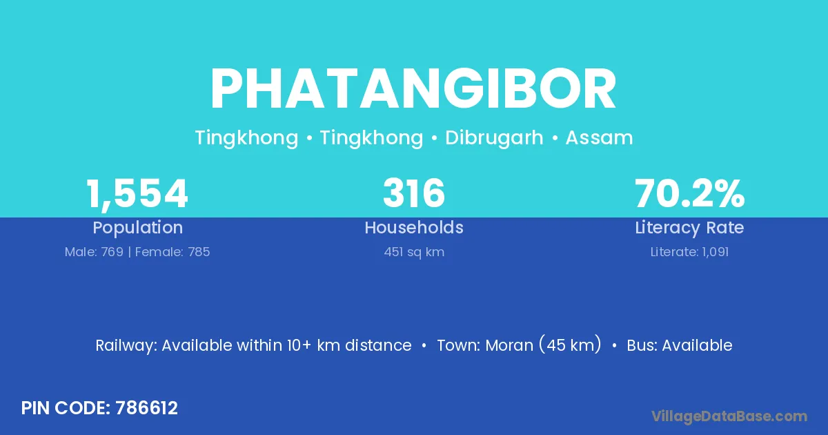 Moran (45 km) is the nearest town to Phatangibor village for major economic activities and is located approximately 45 km away.