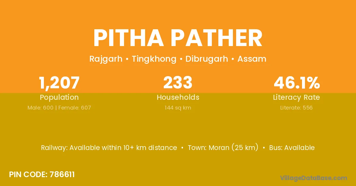 Moran (25 km) is the nearest town to Pitha Pather village for major economic activities and is located approximately 25 km away.