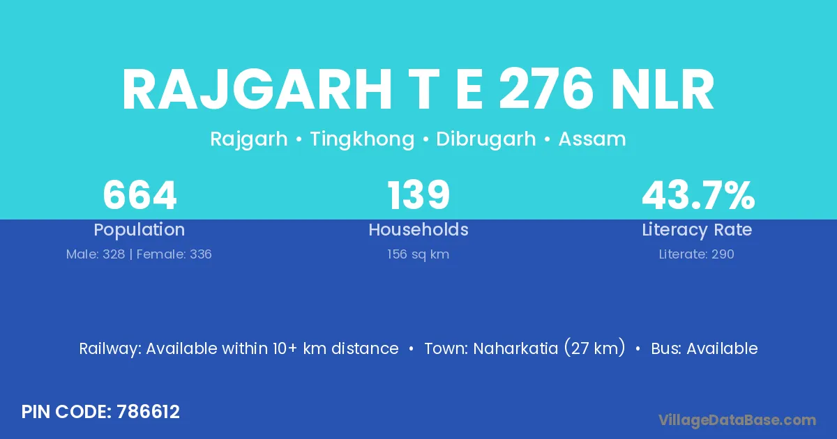Naharkatia (27 km) is the nearest town to Rajgarh T E 276 Nlr village for major economic activities and is located approximately 27 km away.