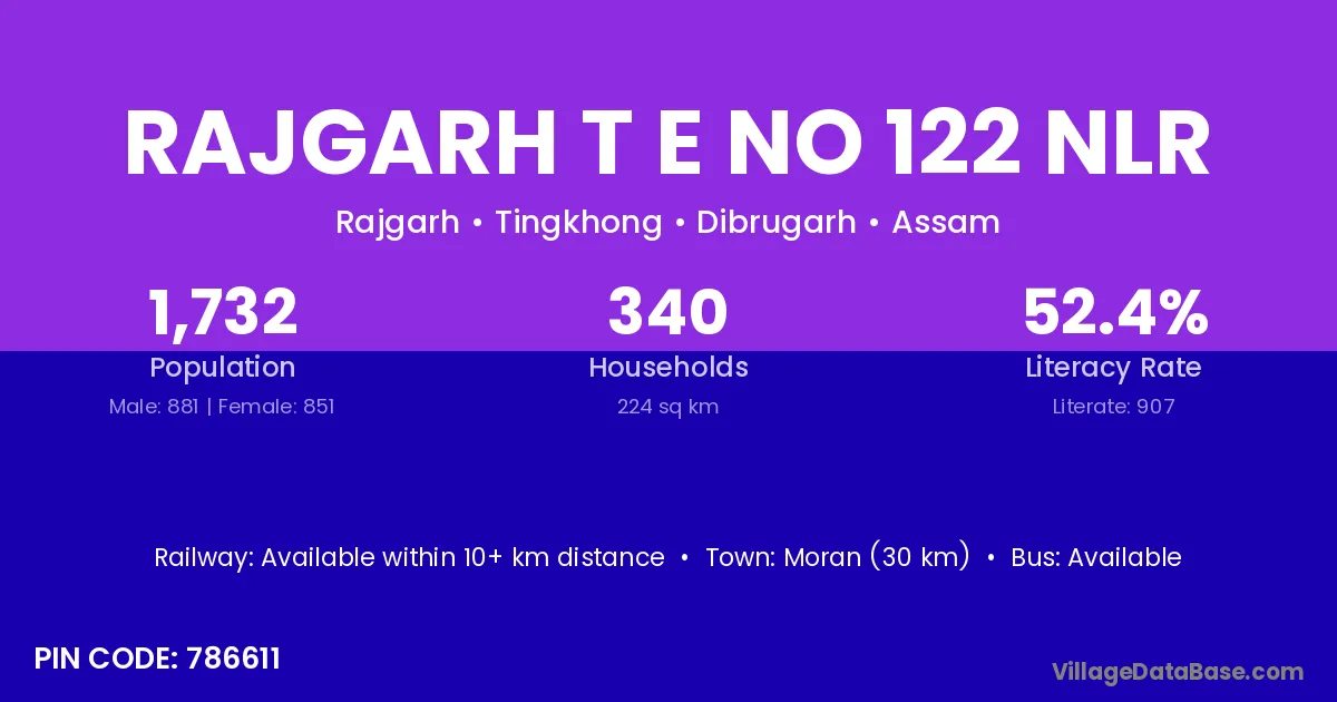 Moran (30 km) is the nearest town to Rajgarh T E No 122 Nlr village for major economic activities and is located approximately 30 km away.