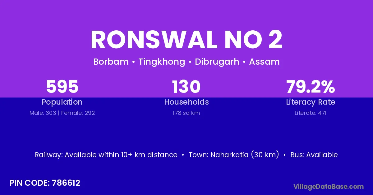 Naharkatia (30 km) is the nearest town to Ronswal No 2 village for major economic activities and is located approximately 30 km away.