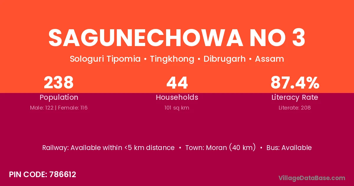Moran (40 km) is the nearest town to Sagunechowa No 3 village for major economic activities and is located approximately 40 km away.