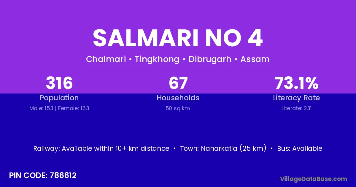 Naharkatia (25 km) is the nearest town to Salmari No 4 village for major economic activities and is located approximately 25 km away.