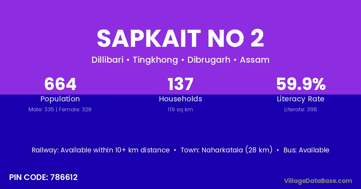 Naharkataia (28 km) is the nearest town to Sapkait No 2 village for major economic activities and is located approximately 28 km away.