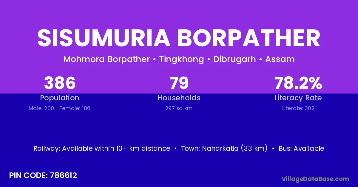 Naharkatia (33 km) is the nearest town to Sisumuria Borpather village for major economic activities and is located approximately 33 km away.