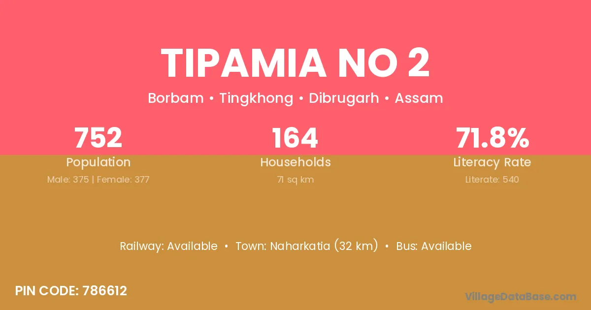 Naharkatia (32 km) is the nearest town to Tipamia No 2 village for major economic activities and is located approximately 32 km away.
