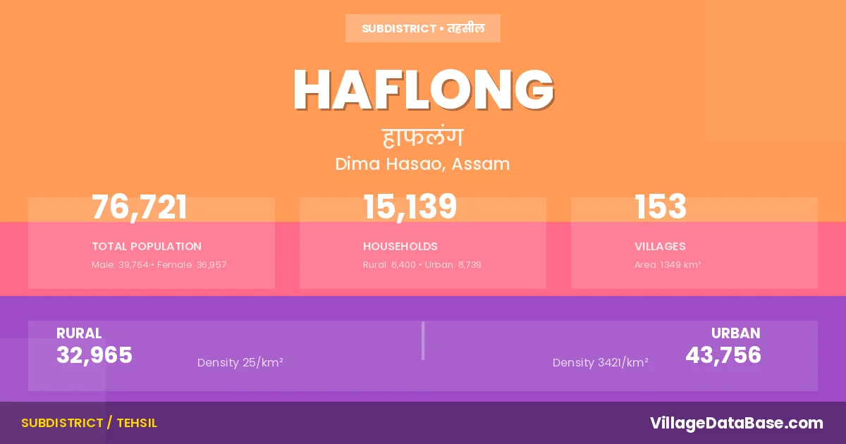 According to the 2011 census The total area of Haflong Subdivision is 1349 km², with a population of 76721 people. The population density is 57 inhabitants per square kilometre, and there are approximately 15139 houses in the sub district.