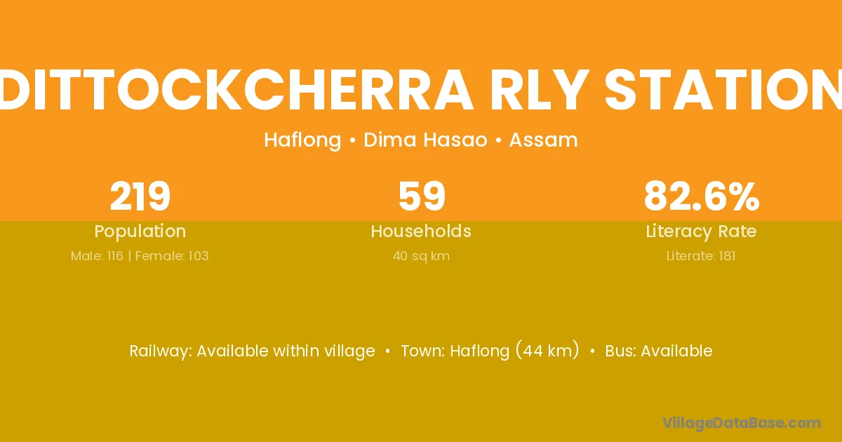 Haflong (44 km) is the nearest town to Dittockcherra Rly Station village for major economic activities and is located approximately 44 km away.