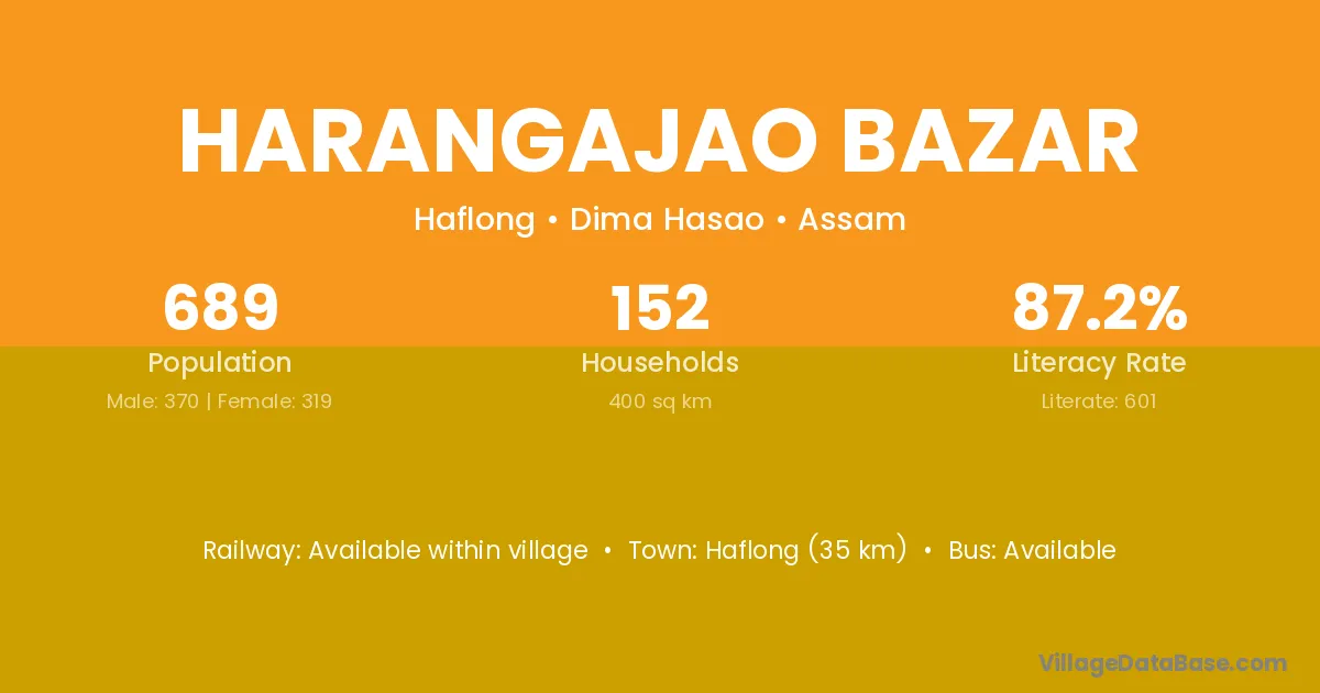 Haflong (35 km) is the nearest town to Harangajao Bazar village for major economic activities and is located approximately 35 km away.