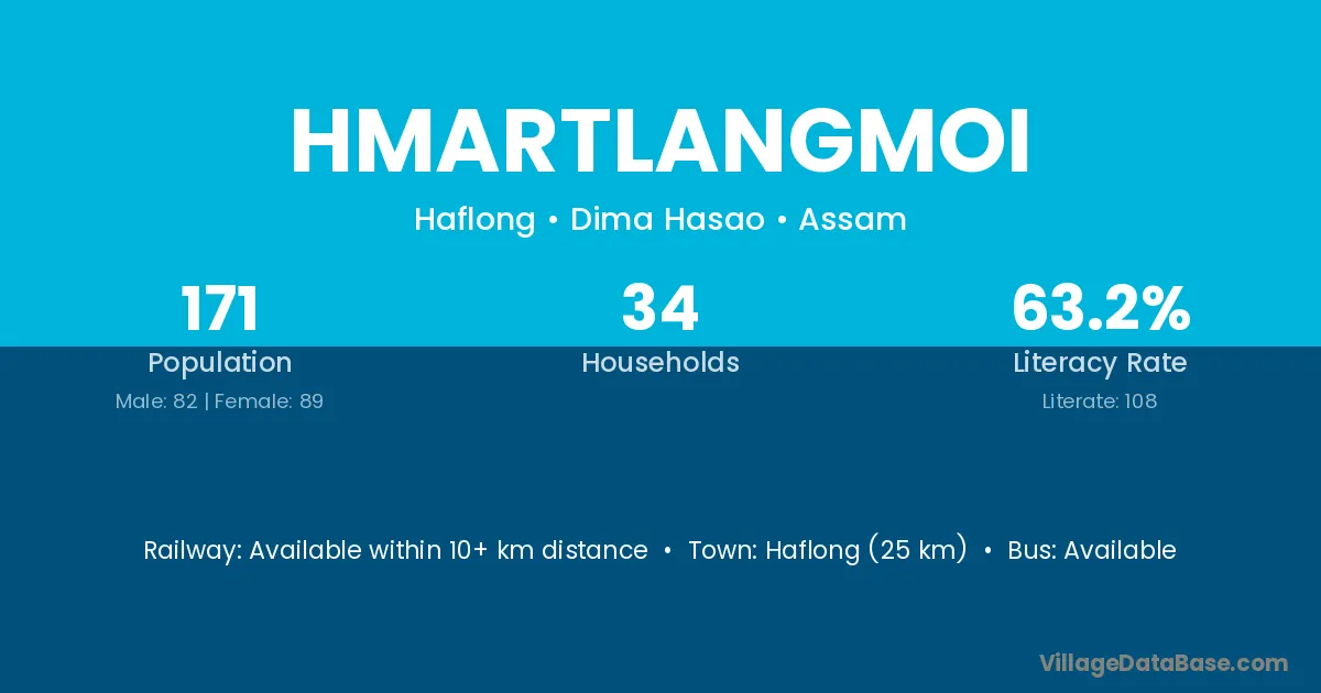 Haflong (25 km) is the nearest town to Hmartlangmoi village for major economic activities and is located approximately 25 km away.