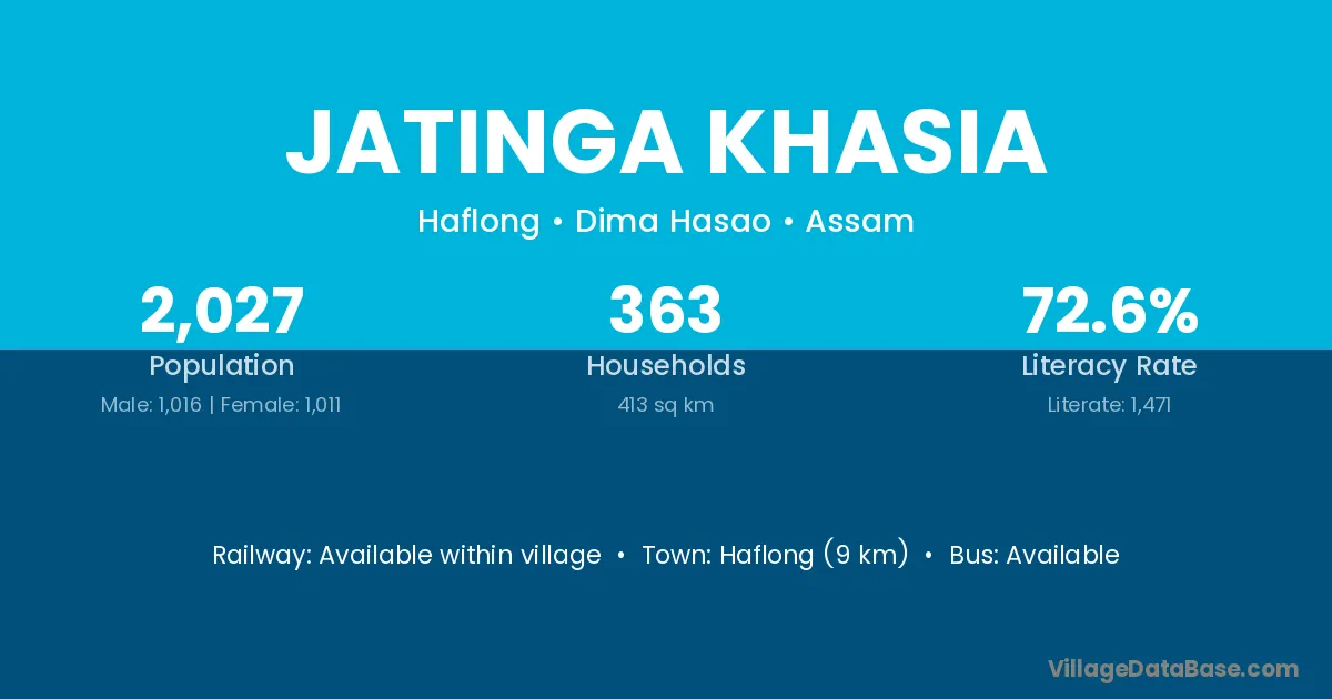Jatinga Khasia village has a total population of 2,027 people, of which 1,016 are males and 1,011 are females.