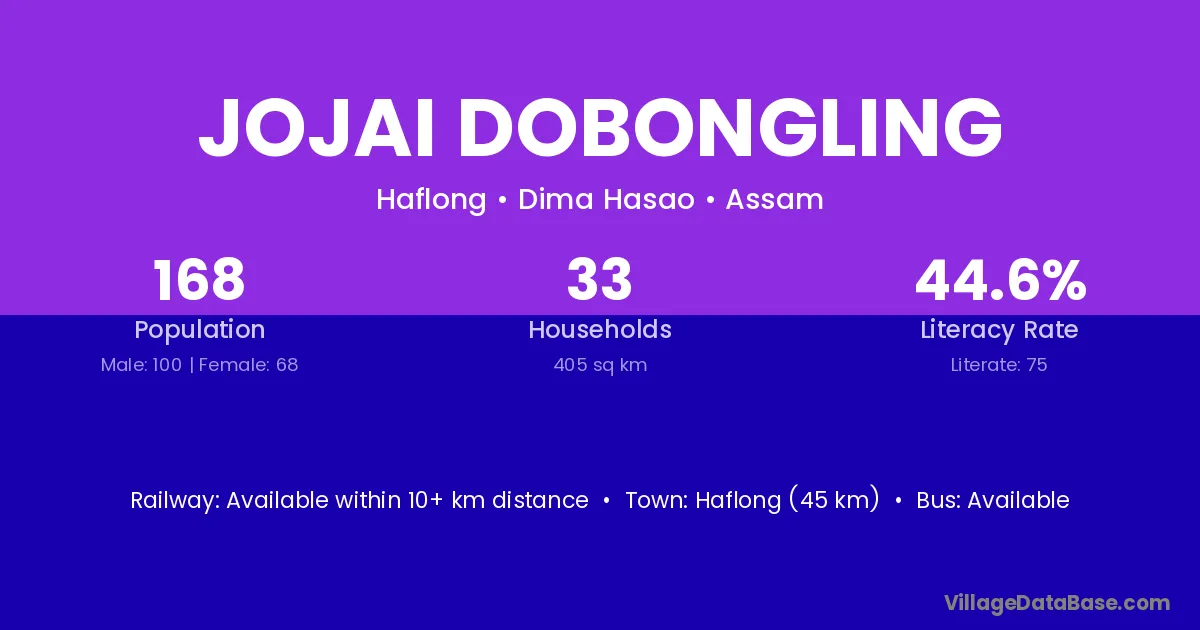 Haflong (45 km) is the nearest town to Jojai Dobongling village for major economic activities and is located approximately 45 km away.