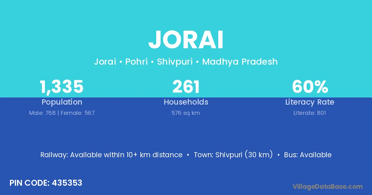 The literacy rate of Jorai village is 42.42%. Male literacy stands at 58.49% and female literacy at 23.91%.