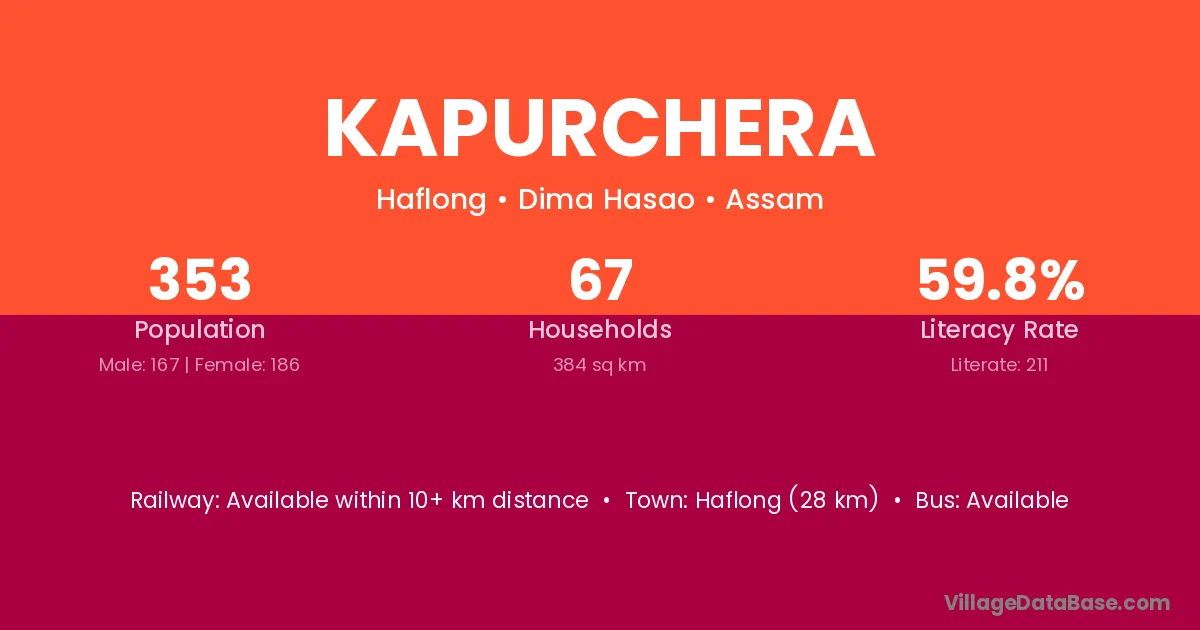 Haflong (28 km) is the nearest town to Kapurchera village for major economic activities and is located approximately 28 km away.