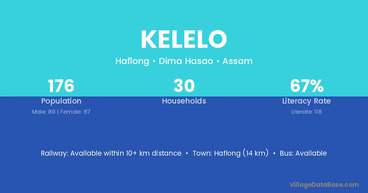 Haflong (14 km) is the nearest town to Kelelo village for major economic activities and is located approximately 14 km away.