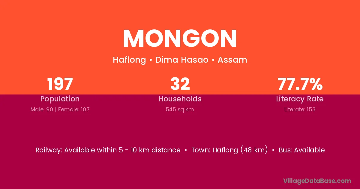 Haflong (48 km) is the nearest town to Mongon village for major economic activities and is located approximately 48 km away.
