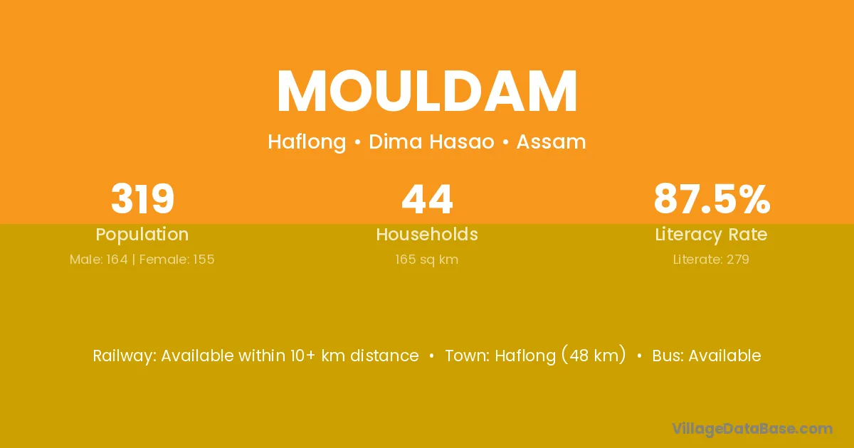 Haflong (48 km) is the nearest town to Mouldam village for major economic activities and is located approximately 48 km away.