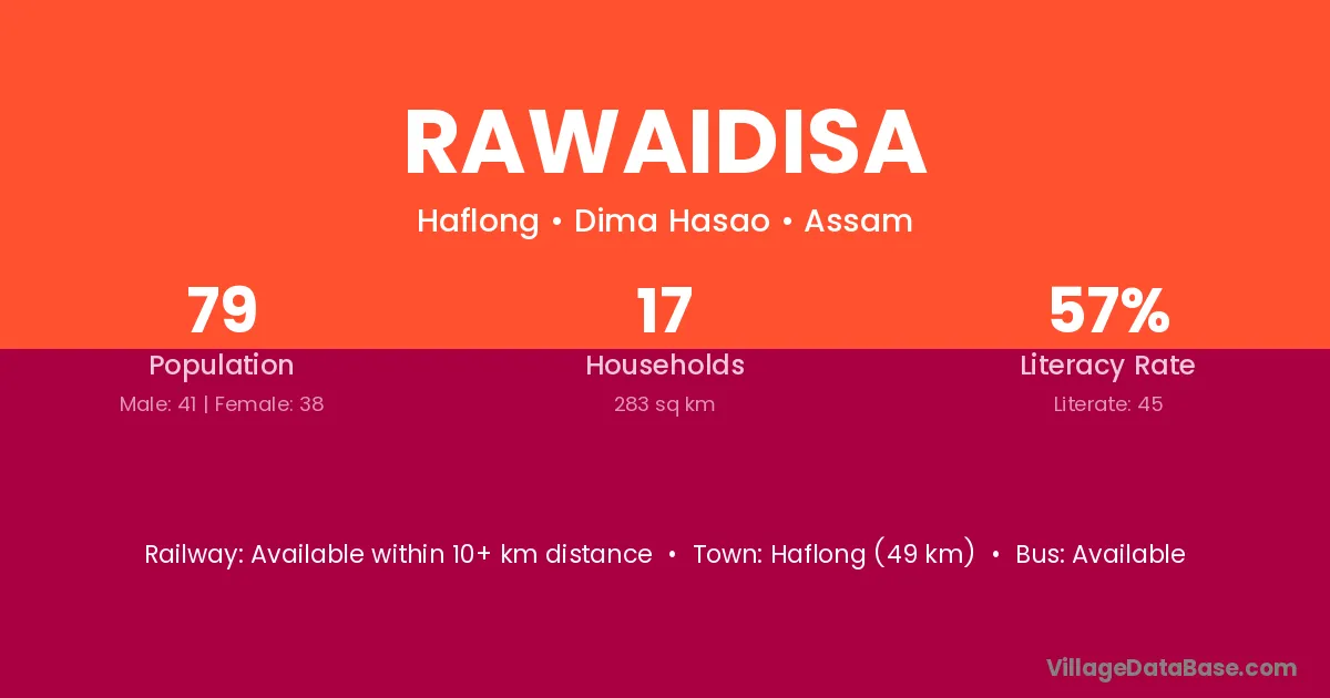 Haflong (49 km) is the nearest town to Rawaidisa village for major economic activities and is located approximately 49 km away.
