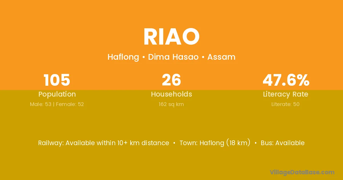 Riao village has a total population of 105 people, of which 53 are males and 52 are females.