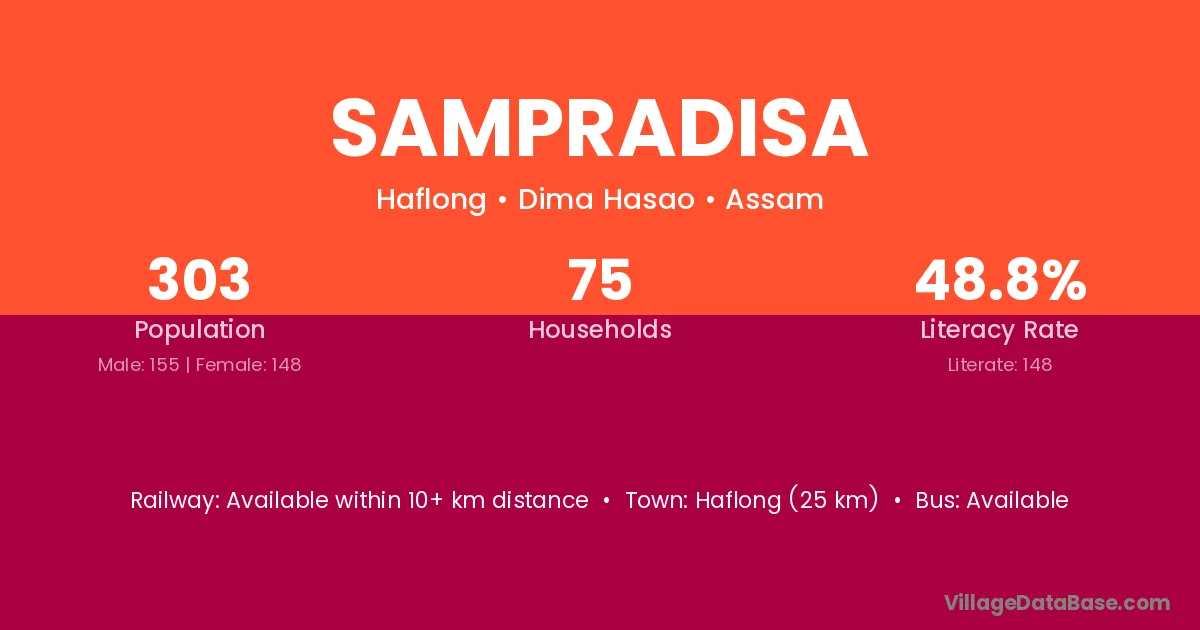 Haflong (25 km) is the nearest town to Sampradisa village for major economic activities and is located approximately 25 km away.
