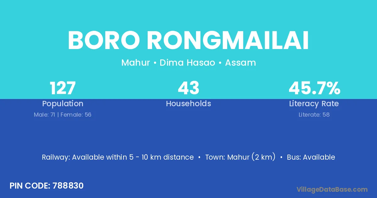 Mahur (2 km) is the nearest town to Boro Rongmailai village for major economic activities and is located approximately 2 km away.