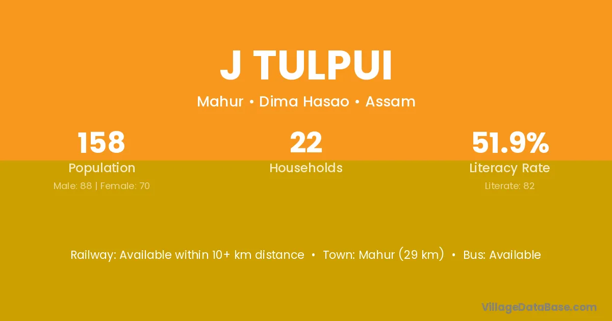 J Tulpui village has a total population of 158 people, of which 88 are males and 70 are females.