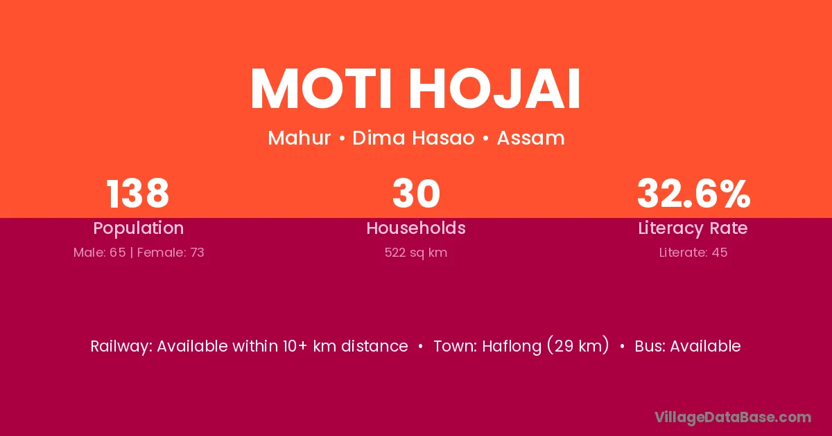 Haflong (29 km) is the nearest town to Moti Hojai village for major economic activities and is located approximately 29 km away.