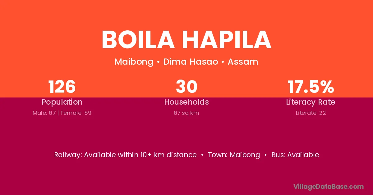 Boila Hapila village has a total population of 126 people, of which 67 are males and 59 are females.