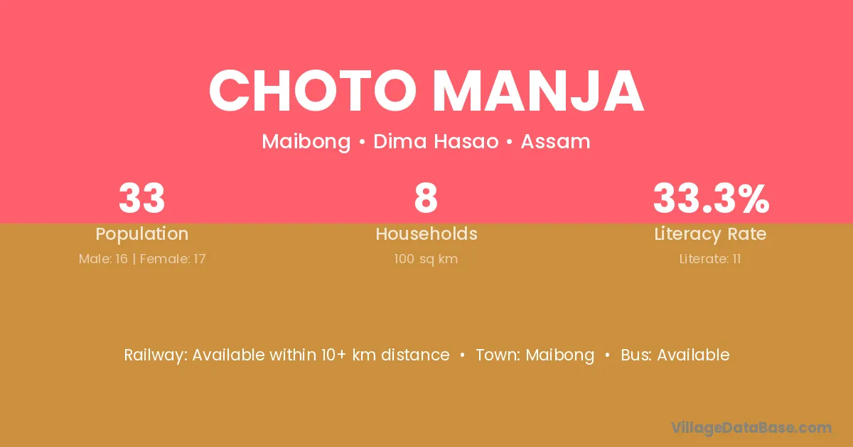 Choto Manja village has a total population of 33 people, of which 16 are males and 17 are females.