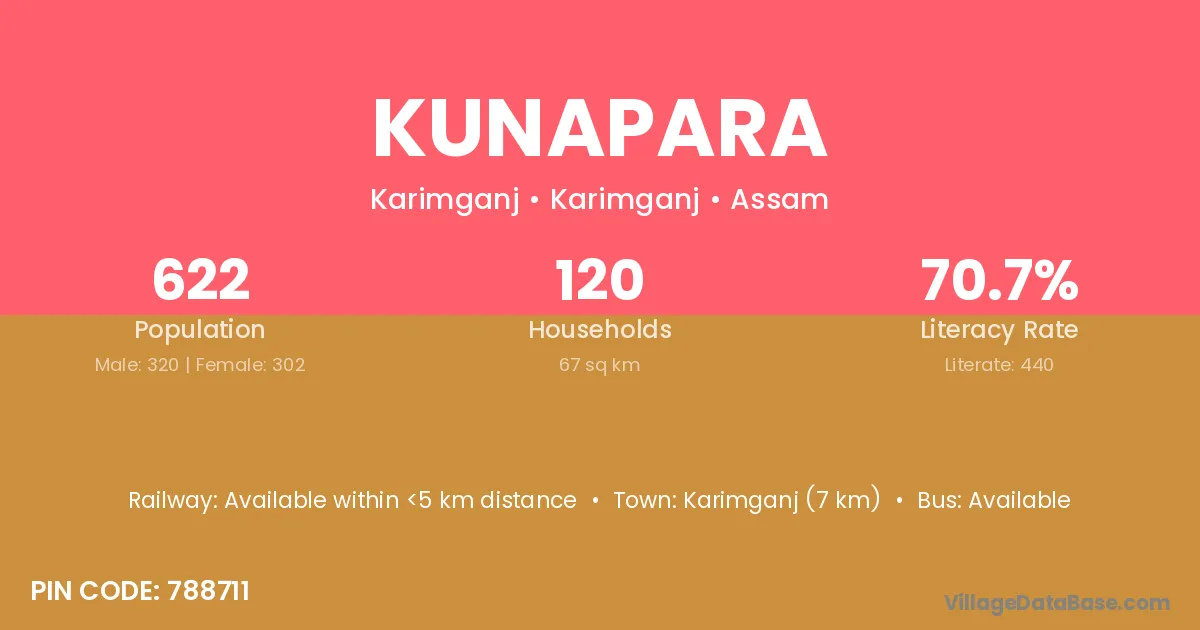 The literacy rate of Kunapara village is 63.38%. Male literacy stands at 74.63% and female literacy at 53.33%.